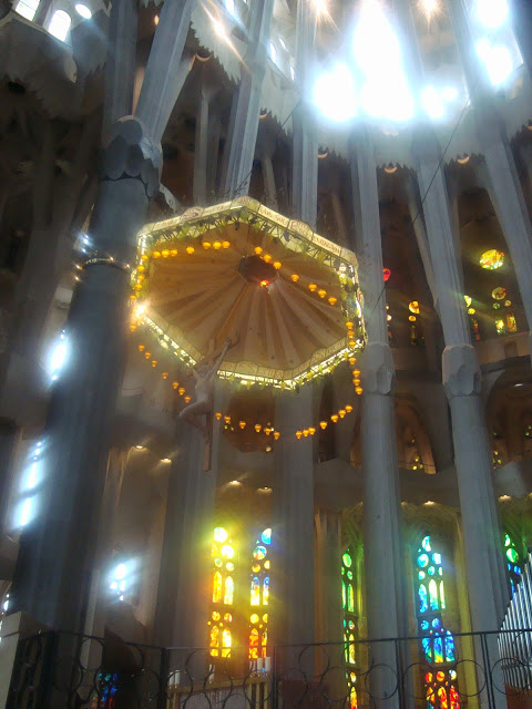 Το παράδοξο με αυτήν την εκκλησία είναι ότι το εξωτερικό σχέδιο δεν έχει καμία απολύτως σχέση με το εσωτερικό. Είναι ίσως ο ομορφότερος ναός που έχω δει ποτέ. Δεν μπορείς καν να καταλάβεις τι σε περιμένει μέσα όταν αντικρίζεις για πρώτη φορά την Sagrada Familia. Μια γοτθικού ρυθμού εκκλησία, με παραστάσεις από τη γέννηση και τη σταύρωση Του Ιησού Χριστού. Μπαίνοντας μέσα, ανακαλύπτεις επιτέλους που έκρυβε τόσα χρόνια ο Θεός το φως. Απλή λιτή και απέριττη. Στο υπόγειο της εκκλησίας υπάρχει έκθεση με εικόνες και διάφορα αντικείμενα, γλυπτά από την κατασκευή της Sagrada, καθώς και ο τάφος του ίδιου του αρχιτέκτονα που μπορεί κάποιος να τον δει από ψηλά καθώς βρίσκεται στην κρύπτη ακριβώς κάτω απ’ το μουσείο. Ο αρχιτέκτονας πέθανε άδοξα. Τον πάτησε τραμ καθώς πήγαινε στην Sagrada του.