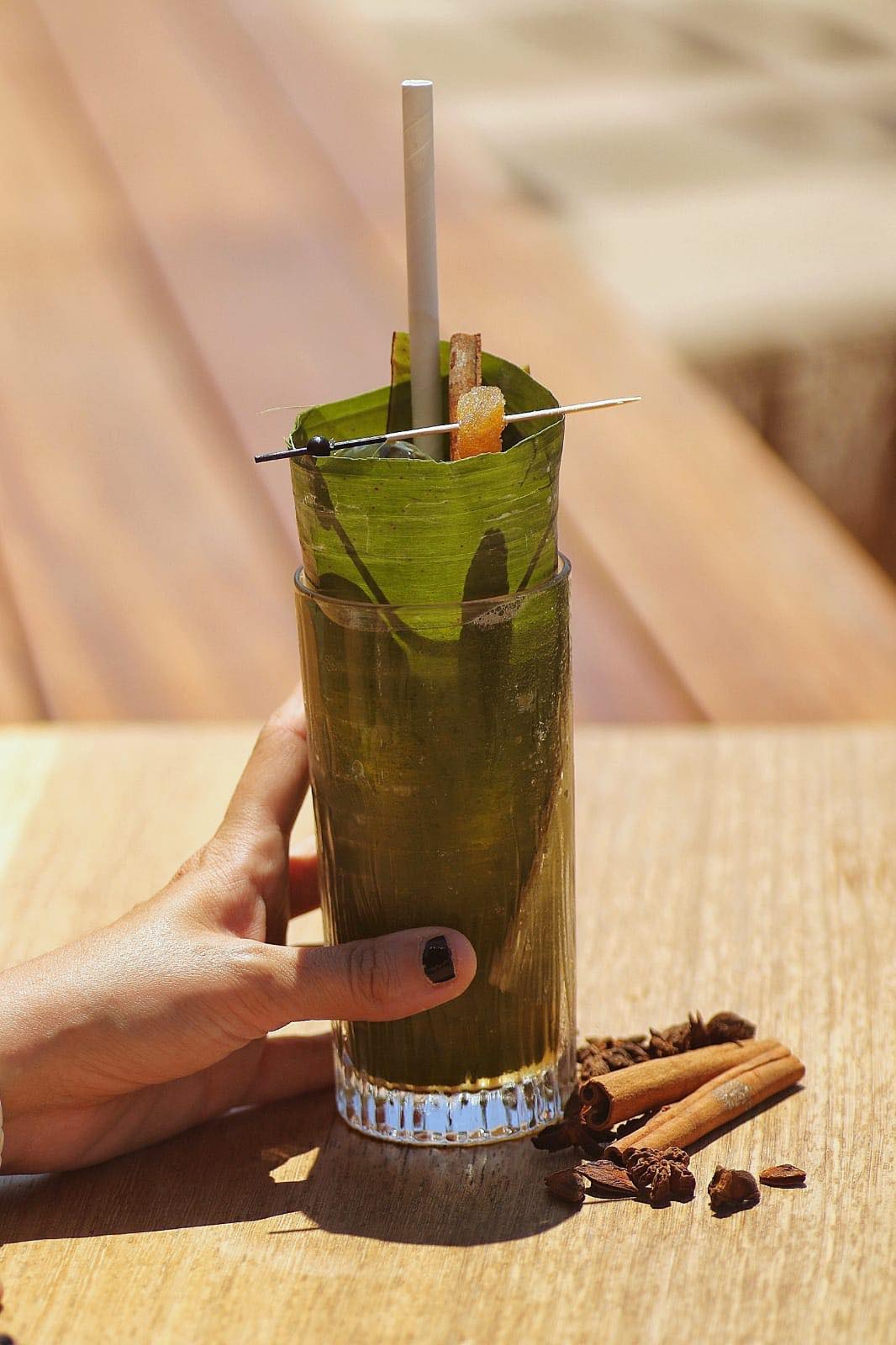 Άρωμα Ελλάδας με το παραδοσιακό λικέρ Ροζολί από τη Λευκάδα μπερδεμένο με μια δόση ginger μπίρας ταράζει ευχάριστα το χειροποίητο ρούμι από την Καραϊβική μαζί με μια νότα λάιμ και σοκολατένιο bitter αφήνοντας μια παιχνιδιάρικη γεύση στο στόμα. Το ποτήρι τυλίγεται εσωτερικά από ένα πράσινο φύλλο μπανάνας!