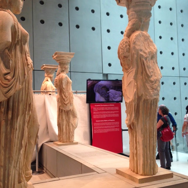 Να σημειωθεί πως και οι υπόλοιποι όροφοι του μουσείου είναι εξίσου σημαντικοί με μοναδικά εκθέματα. Καταρχήν οι Καρυάτιδες που κρατούσαν το Ερέχθειο (μικρός ναός δίπλα στον Παρθενώνα). Στέκουν αγέρωχες και πεντακάθαρες πια (παρακολουθούμε live μέσα από κάμερα τον καθαρισμό τους, καθώς δίπλα τους έχει στηθεί ένα μίνι εργαστήριο που τις καθαρίζει επιτόπου) για να τις θαυμάσουμε. Όλες εκτός από μια. Πολύ εύστοχο είναι το κενό στη μέση των εκθεμάτων, μια κενή θέση, που περιμένει (μάταια;) την επιστροφή της Καρυάτιδας από το Βρετανικό Μουσείο. Σου δημιουργείται ένα αίσθημα κενού. Όλες μαζί και μια απούσα. Στο Βρετανικό μουσείο η Καρυάτιδα είναι παντελώς μόνη. Ένα άγαλμα ανάμεσα σε τόσα άλλα. Ενώ στο Μουσείο της Ακρόπολης θεωρώ πως θα έβρισκε τη θέση της. Αλλά αυτό είναι ένα άλλο θέμα…