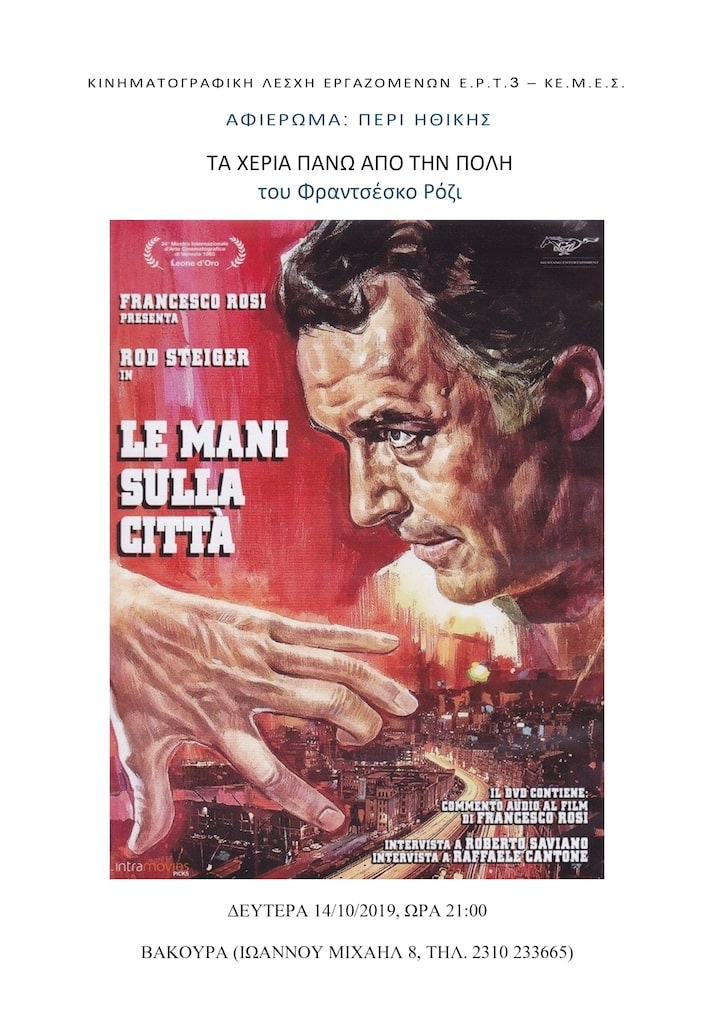 Με το βραβευμένο, πολιτικό, κλασικό αριστούργημα «Τα χέρια πάνω από την πόλη» (Le mani sulla citta, ασπρόμαυρο, Ιταλία 1963, διάρκεια 101´) συνεχίζεται τη Δευτέρα 14 Οκτωβρίου το αφιέρωμά «Περί ηθικής» της κινηματογραφικής λέσχης των εργαζομένων της ΕΡΤ3 και του Κέντρου Μελετών και Ερευνών για το Σινεμά (ΚΕΜΕΣ). Σε σκηνοθεσία του Φραντσέσκο Ρόζι και με πρωταγωνιστή τον Ροντ Στάιγκερ, το φιλμ κέρδισε το Χρυσό Λιοντάρι στο Φεστιβάλ Βενετίας.