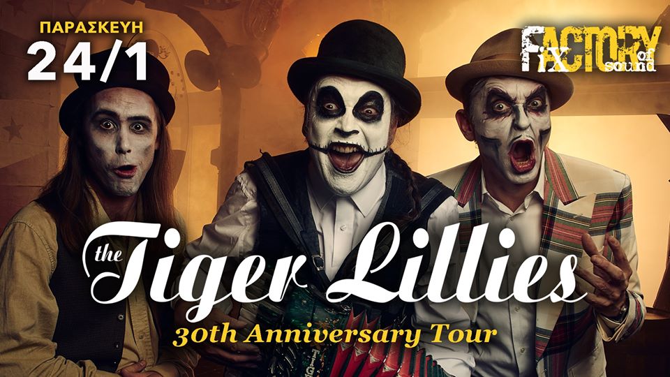 Οι θρυλικοί Tiger Lillies επιστρέφουν στη Θεσσαλονίκη για να γιορτάσουν μαζί με το αγαπημένο τους κοινό 30 χρόνια σκοτεινής, προκλητικής και γεμάτης μαύρο χιούμορ πορείας και σκηνικής παρουσίας, την Παρασκευή 24 Ιανουαρίου στο Fix Factory Of Sound!