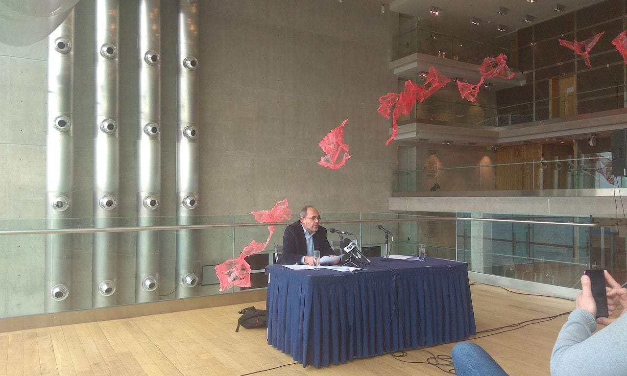 Ο πρόεδρος του δ.σ. του Μεγάρου Μουσικής Θεσσαλονίκης Νικήτας Μυλόπουλος κατά τη συνέντευξη Τύπου που δόθηκε στο ΜΜΘ στις 20 Ιανουαρίου 2020.