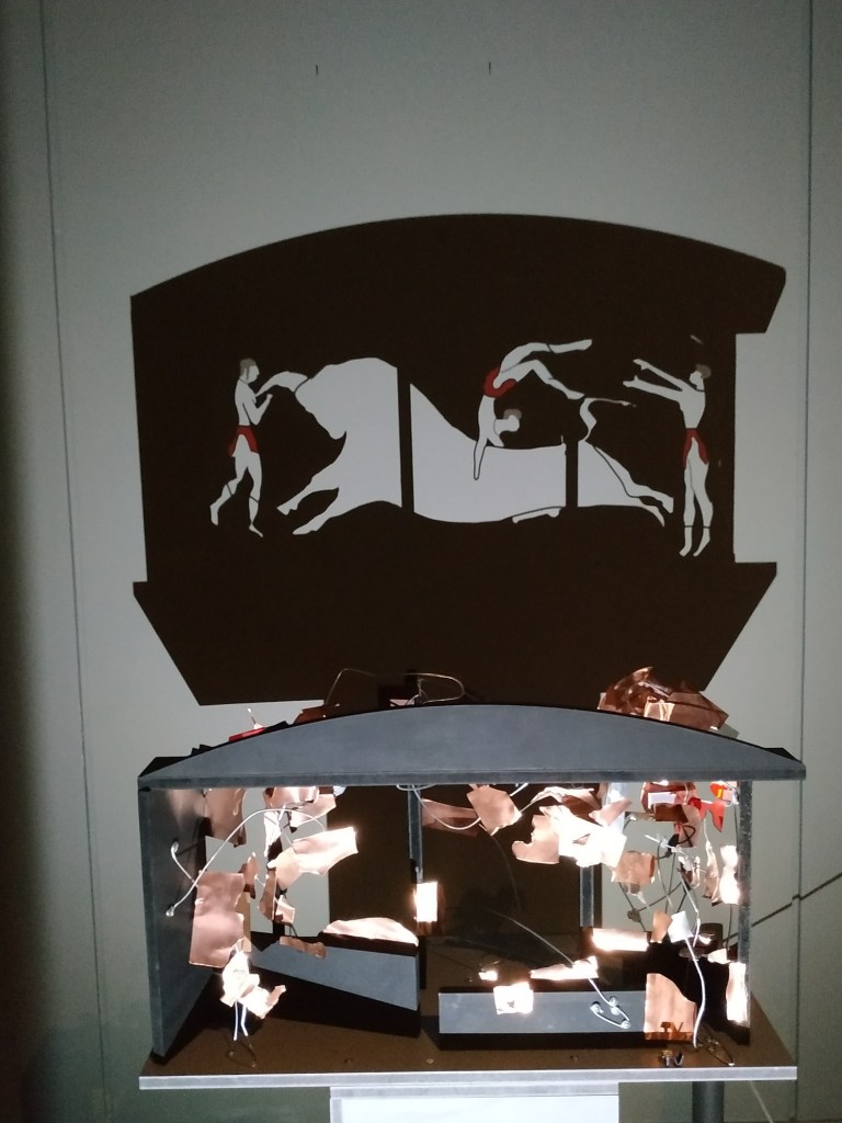 Δύσκολη ερώτηση. Αν απαντήσω έχοντας ως βασικό κριτήριο την εμφάνιση του έργου τότε θα έλεγα πως το έργο με τίτλο «Ο Αθλητισμός εμπνέει καλλιτέχνες», που απεικονίζει τα Ταυροκαθάψια, είναι το αγαπημένο έργο της ενότητας αυτής. Αν πάλι εστιάσω στη φιλοσοφία του έργου θα διάλεγα το έργο «Όμως ο άνθρωπος συνεχίζει». Το δούλεψα με δύο λάμπες, οι οποίες παραλληλίζονται με τις παραμέτρους της φύσης και του ανθρώπινου πολιτισμού, με στόχο όμως να δημιουργήσω μία σκιά, τον άνθρωπο που συνεχίζει. Ο φιγούρα του ανθρώπου είναι στην ουσία η τομή των δύο σκιών, περνώντας κατ’ αυτόν τον τρόπο το μήνυμα πως πρέπει να πορεύεται στην τομή των δύο προηγούμενων παραμέτρων, της φύσης και του ανθρώπινου πολιτισμού. Πρόκειται κατά κάποιο για ένα μαθηματικό και παράλληλα φιλοσοφικό έργο. Είναι σημαντικό επίσης να τονίσω πως αυτή τη στιγμή είναι το πρώτο και μοναδικό έργο με δύο φωτισμούς και μία σκιά, σε όλο τον κόσμο.