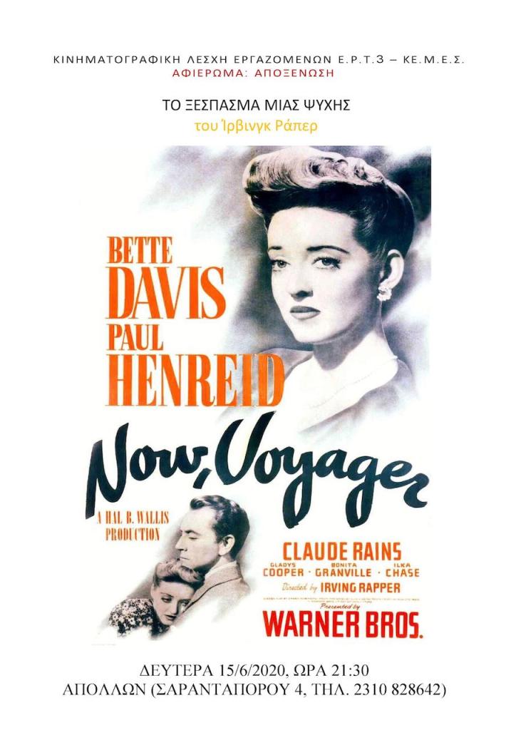 Με το σπουδαίο ρομαντικό μελόδραμα «Το ξέσπασμα μιας ψυχής» («Now, Voyager», ασπρόμαυρο,Η.Π.Α. 1942, διάρκεια 117΄) σε σκηνοθεσία Ίρβινγκ Ράπερ, συνεχίζεται το αφιέρωμα «Αποξένωση» από την κινηματογραφική λέσχη εργαζομένων της ΕΡΤ3 και το ΚΕΜΕΣ, τη Δευτέρα 15 Ιουνίου στις 21:30 στο θερινό cine ΑΠΟΛΛΩΝ (Σαρανταπόρου 4 – Βασιλέως Γεωργίου, τηλ. 2310828642). Το σενάριο βασίζεται στο ομώνυμο μυθιστόρημα της Όλιβ Χίγκινς Πράουτι, τη διασκευή για τη μεγάλη οθόνη έκανε ο Κέισι Ρόμπινσον, ενώ πρωταγωνιστούν οι Μπέτι Ντέιβις, Πολ Χένριντ, Κλοντ Ρέινς και Γκλάντις Κούπερ. Βραβεύτηκε με όσκαρ μουσικής για τον Μαξ Στάινερ, ενώ έλαβε άλλες δύουποψηφιότητες, για τη Μπέτι Ντέιβις (α’ γυναικείο ρόλο) και την Γκλάντις Κούπερ (β΄ γυναικείο).