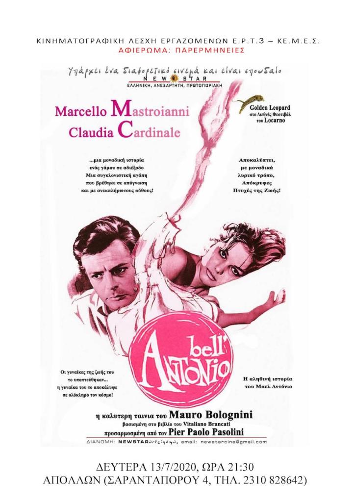 Ένα νέο κινηματογραφικό αφιέρωμα εγκαινιάζει η κινηματογραφική λέσχη εργαζομένων ΕΡΤ3 και ΚΕΜΕΣ με θέμα «Παρερμηνείες». Την Δευτέρα 13 Απριλίου στο θερινό Απόλλων (τηλ. 2310828642) στις 21:15 την ταινία BELL’ ΑΝΤΟΝΙΟ.