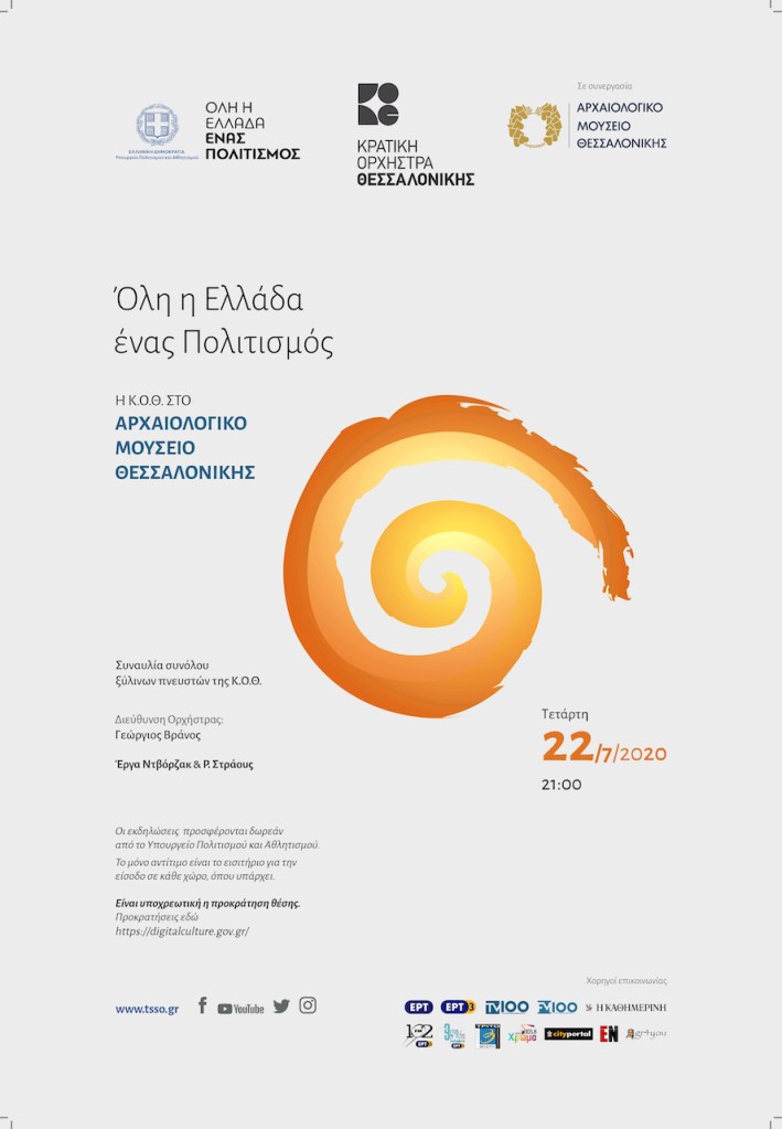 Την Τετάρτη 22/7, στο αίθριο του Αρχαιολογικού Μουσείου Θεσσαλονίκης, σύνολο ξύλινων πνευστών της Κ.Ο.Θ.. παρουσιάζει δύο υπέροχες σερενάτες των Αντονίν Ντβόρζακ και Ρίχαρντ Στράους. Διευθύνει ο Γεώργιος Βράνος.