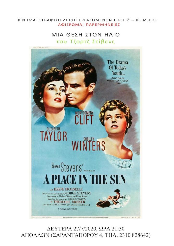 «Μιλώντας για καραμπινάτα μελοδράματα, σίγουρα αναφερόμαστε και στο «Μια θέση στον ήλιο», με εμβληματικό τίτλο και πολλά Όσκαρ, συνοδεία άφθονων δακρύων. Ο κορυφαίος Έλληνας κριτικός κινηματογράφου όλων των εποχών και δάσκαλός μου, ο Λάμπρος Παπαχρόνης, έγραφε για τον Τζορτζ Στίβενς πως ανήκει στους «ιπποπόταμους» του σινεμά και είχε απόλυτο δίκιο. Όλα στις ταινίες του γιγαντιαία, υπερμεγέθη, εντυπωσιακά.