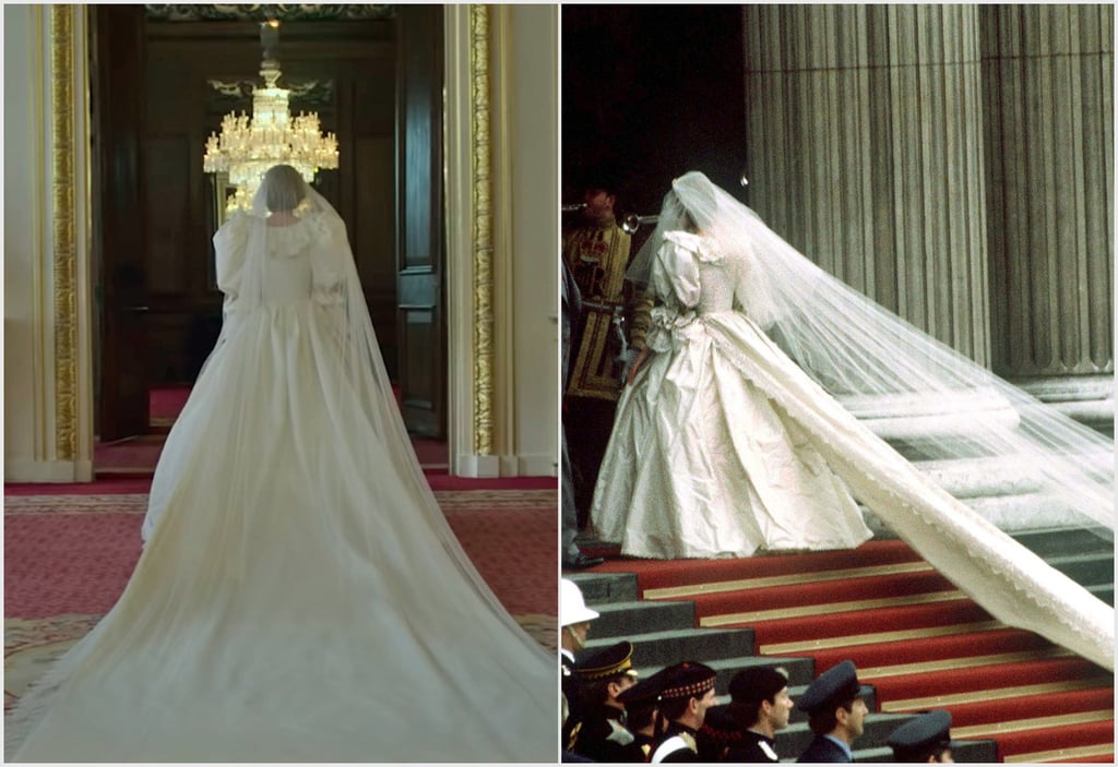 Όπως εξομολογήθηκε η ίδια η Κορίν στο αμερικανικό Harpe’s Bazaar, οι ενδυματολόγοι της σειράς κλήθηκαν, για τις ανάγκες των γυρισμάτων, να φτιάξουν ένα νυφικό ολόιδιο με εκείνο που φορούσε η Νταϊάνα στον γάμο της με τον διάδοχο του βρετανικού θρόνου στις 29 Iουλίου του 1981.