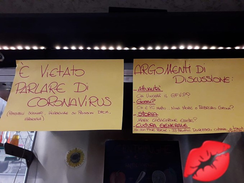 Όχι επειδή ξαφνικά σταμάτησαν να υπάρχουν στην καθημερινότητά τους, αλλά πολύ απλά γιατί απαγορεύεται ρητά από τους ιδιοκτήτες του καταστήματος. Αναγράφεται άλλωστε και τις πινακίδες που έχουν αναρτηθεί επάνω από το ταμείο του μαγαζιού, στο οποίο οι σκοτούρες που φέρνει ο Covid-19 είναι απλά ανεπιθύμητες. Ενώ δίπλα στην εντολή απαγόρευσης προτείνονται και εναλλακτικά θέματα συζήτησης όπως διαφορετικές ειδήσεις από την επικαιρότητα, ιστορικά γεγονότα, ακόμα και κουτσομπολιά.