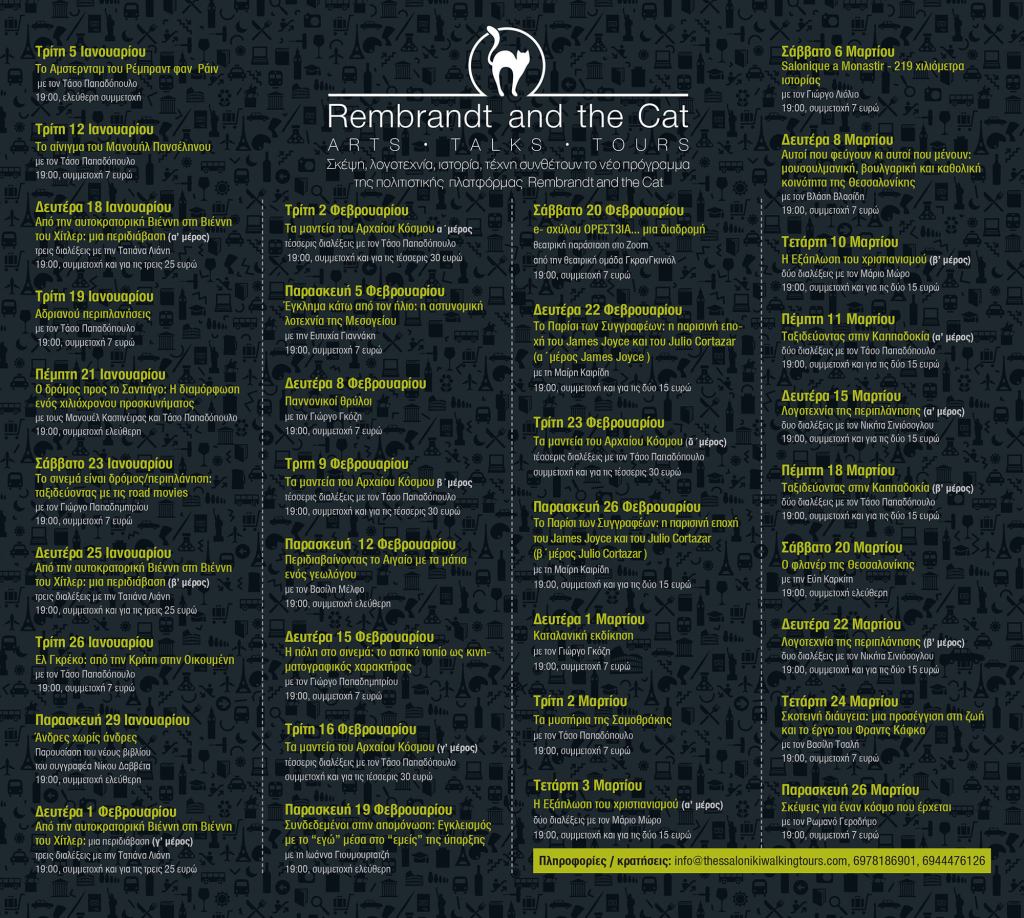 Για μια ακόμη φορά η διαδικτυακή πλατφόρμα πολιτισμού Rembrandt and the Cat δίνει έμφαση στη πολυφωνία, την εγκυρότητα, τα διαφορετικά γνωστικά πεδία, τη θεματική ποικιλία ώστε τα βράδια μας να μοιάζουν με συναρπαστικές διανοητικές περιπέτειες από εκείνες που ενώνουν διαφορετικούς μεταξύ τους ανθρώπους και δίνουν στην ζωή μας νόημα.