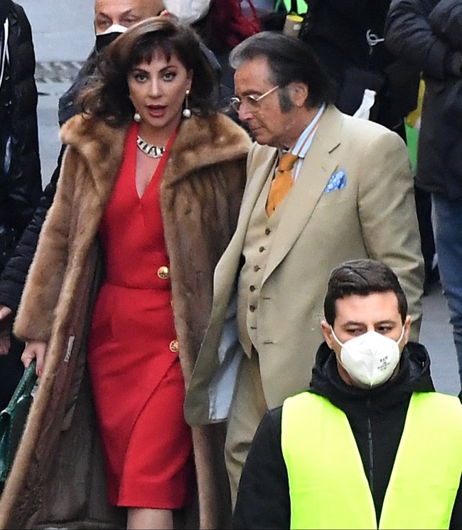 Η Lady Gaga που πρωταγωνιστεί στην ταινία για την πιο διάσημη οικογένεια της μόδας ως Patrizia Reggiani, είναι στο πλευρό του Al Pacino και φοράει ένα κόκκινο φόρεμα που έχει συνδυάσει με γούνα.