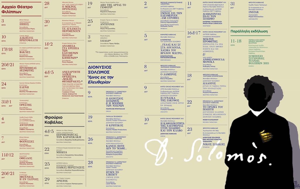 Οι συγγραφείς Άκης Δήμου, Γλυκερία Μπασδέκη και Χάρης Μιχαλόπουλος, μετά από παραγγελία του Φεστιβάλ, γράφουν τρεις θεατρικούς μονολόγους (με θέμα τον Σολωμό) για να παρουσιαστούν από τους ηθοποιούς Δέσποινα Παπάζογλου, Μάρω Παπαδοπούλου, Άρη Νινίκα και τον μικρό Φώτιο Ευαγγελίδη, ενώ ο σκιτσογράφος Δημήτρης Χαντζόπουλος σχεδίασε ψηφιακά, ειδικά για το Φεστιβάλ Φιλίππων, το πορτραίτο του Διονυσίου Σολωμού ως την κεντρική αφίσα της φετινής διοργάνωσης. Επίσης, η θεατρική ομάδα Κουίντα (Παύλος Σταυρόπουλος και Ναταλία-Άννα Βασιλέκα) παρουσιάζουν τον Κρητικό, ο ποιητής και performer Κωνσταντίνος Παπαχαράλαμπος συνομιλεί με τον Πόρφυρα, ο συνθέτης Νίκος Ξυδάκης «ξαναδιαβάζει» – με δικές του μελωδίες – ποιήματα του Διονυσίου Σολωμού σε μια συναυλία με τίτλο Διονύσιος Σολωμός –Ένα μουσικό ποιητικό σχεδίασμα, η ερμηνεύτρια Νιόβη Κλαυδιανού με τον συνθέτη Σπύρο Σουλαδάκη, ετοιμάζουν μια μουσική παράσταση σε ποίηση του Σολωμού και η ομάδα χορού «Πρόσχημα» της Μαρίας Κολιοπούλου δημιουργεί μια παράσταση για ζητήματα ταυτότητας και ελευθερίας.