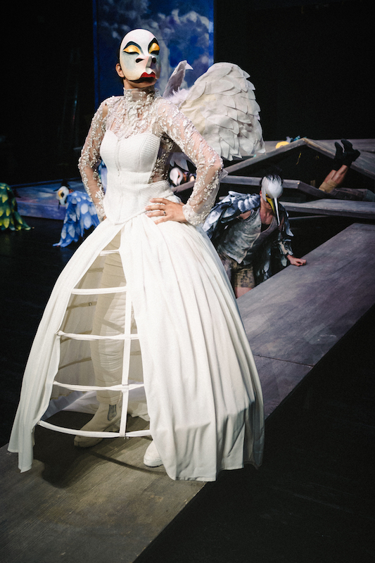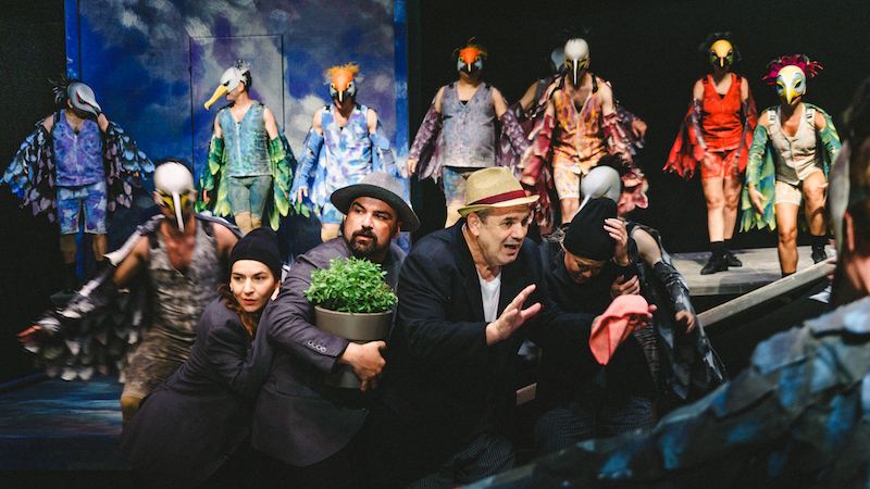 Παίζουν οι ηθοποιοί: Ελευθερία Αγγελίτσα (Τριβαλλός), Λίλα Βλαχοπούλου (Υπηρέτης του Έποπα), Ιωάννα Δεμερτζίδου (Κήρυκας, Πουλί από το Παρελθόν), Δημήτρης Διακοσάββας (Κινησίας), Αριστοτέλης Ζαχαράκης (Επιθεωρητής, Ψευδομάρτυρας), Χριστίνα Ζαχάρωφ (Ψευδομάρτυρας, Δούλος), Νίκος Κουσούλης (Β΄ Αγγελιοφόρος), Ήριννα Κεραμίδα (Ψευδομάρτυρας, Δούλος), Μαριάννα Κιμούλη (Κήρυκας), Γιώργος Κολοβός (Προμηθέας), Αναστασία-Ραφαέλα Κονίδη (Κήρυκας), Μάρα Μαλγαρινού (Κήρυκας, Πουλί Δερβίσης), Τατιάνα Μελίδου (Ψευδομάρτυρας, Βασιλεία), Χρυσή Μπαχτσεβάνη (Κήρυκας), Κλειώ-Δανάη Οθωναίου (Ίρις), Βασίλης Παπαδόπουλος(Έποπας Μέτων, Ψευδομάρτυρας), Γρηγόρης Παπαδόπουλος (Ηρακλής), Θανάσης Ραφτόπουλος(Μέτων, Ψευδομάρτυρας), Θανάσης Ρέστας (Α΄ Αγγελιοφόρος, Ποσειδών), Γιάννης Σαμψαλάκης (Ευελπίδης), Στέφανος Πίττας (Συνταγματολόγος), Κατερίνα Σισίννι (Αγγελιοφόρος), Βασίλης Σπυρόπουλος (Ιερέας), Γιάννης Τσεμπερλίδης (Ποιητής), Ιώβη Φραγκάτου (Χρησμολόγος), Ταξιάρχης Χάνος (Πεισθέταιρος), Κορίνα Αθανασούλα (κοράκια), Άννα Ευθυμίου (κοράκια), Αλίκη Ζαχαροπούλου (κοράκια)