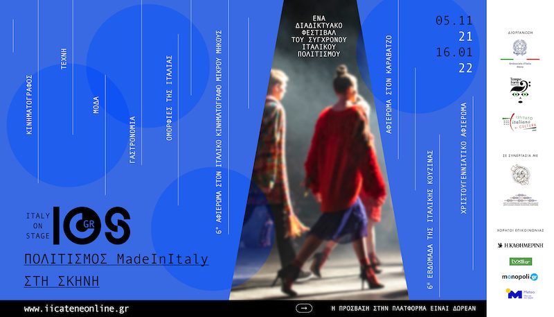 Η Πρεσβεία της Ιταλίας στην Ελλάδα και το Ιταλικό Μορφωτικό Ινστιτούτο της Αθήνας, στο πλαίσιο της πολιτιστικής πρωτοβουλίας Tempo Forte, σε συνεργασία με τον Πολιτιστικό Σύλλογο AIAL και με την υποστήριξη της Ταινιοθήκης της Ελλάδος, προσκαλούν τους σινεφίλ, φιλότεχνους και θιασώτες της ιταλικής κουλτούρας και γαστρονομίας που ζουν στην Ελλάδα, στο Διαδικτυακό Φεστιβάλ Σύγχρονου Ιταλικού Πολιτισμού ItalyOnStage -ένα πλούσιο πρόγραμμα με online προβολές που πραγματοποιείται από το Νοέμβριο του 2021 έως τον Ιανουάριο του 2022. Πρόκειται για την όγδοη ψηφιακή διοργάνωση Cultura Made In Italy.