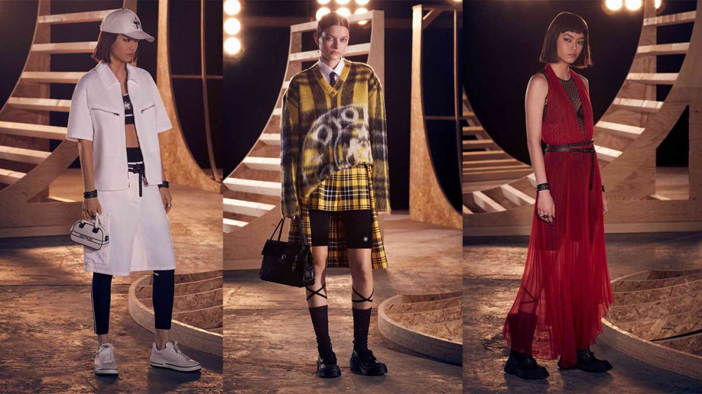 H FW’22 συλλογή Dior, όμως, δεν ήταν μόνο αυτό, ένα πείραμα με τις νέες τεχνολογίες. Στοιχεία μοντέρνας θηλυκότητας όπως οι δερμάτινες corset belts αλλά και οι adjustable δαντελένιοι κορσέδες, οι ζώνες με τσέπες που εξασφαλίζουν πρακτικότητα, οι ασύμμετρες φούστες που δημιουργούν διαφορετική εντύπωση ανάλογα με την πλευρά που θα τις κοιτάξει κανείς (μακριά, κοντή, ίσια ή πλισέ), τα θηλυκά μαύρα φορέματα, οι καμπαρντίνες, τα καρό πανωφόρια και οι καρό φούστες που συνδυάζονται σε σετ, τα ντένιμ κομμάτια με φλόράλ μοτίβα που επίσης συνδυάζονται σε twinsets, αλλά και τα αέρινα μάξι φορέματα που έρχονται ως ανάλαφρη eveningwear πρόταση, συνθέτουν μια συλλογή που διακρίνεται από έντονη διάθεση πρακτικότητας – ακόμα και η Lady Dior ανασχεδιάζεται για να χωράει τα απαραίτητα- κι ευελιξίας- τα κομμάτια μπορούν να συνδυαστούν μεταξύ τους με διάφορους τρόπους, ενώ υιοθετεί υβριδικές μορφές σε looks που μεταφέρουν τη κομψότητα στο μέλλον και κλείνουν το μάτι στην Gen Z.