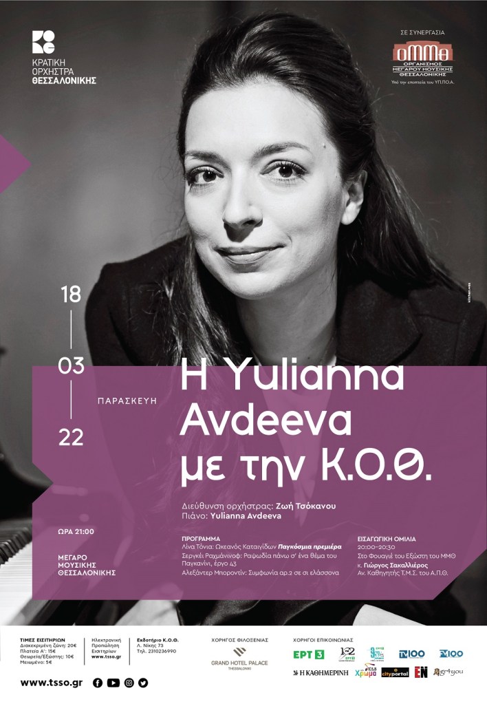 Η Κρατική Ορχήστρα Θεσσαλονίκης υποδέχεται μία από τις μία από τις πλέον χαρισματικές πιανίστες των ημερών μας, την Yulianna Avdeeva, που το φλογερό ταμπεραμέντο της και η ποιότητα των ερμηνειών της έχουν κερδίσει κοινό και κριτικούς παγκοσμίως. Την Κ.Ο.Θ. διευθύνει η Ζωή Τσόκανου.