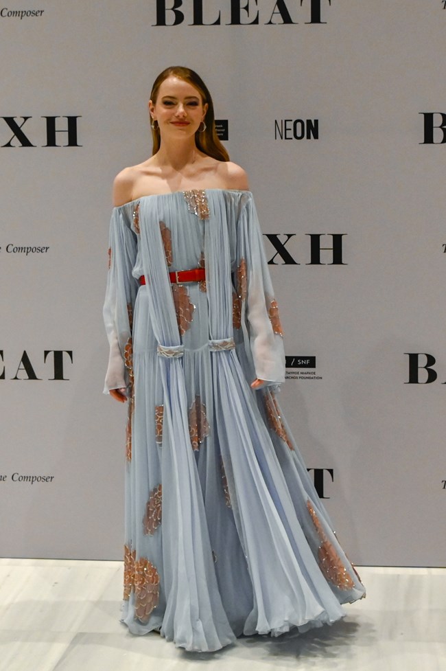 Στη χώρα μας βρίσκεται η Emma Stone για την προώθηση της ταινίας «Βληχή» του Γιώργου Λάνθιμου. Στην χθεσινοβραδυνή πρεμιέρα του φιλμ βρέθηκε η βραβευμένη με Όσκαρ πρωταγωνίστρια στην Εθνική Λυρική Σκηνή του Ιδρύματος Σταύρος Νιάρχος φορώντας μια αέρινη δημιουργία από μεταξωτό chiffon στην αγαπημένη της light blue απόχρωση, με περίτεχνα κεντημένα σχέδια. Το φόρεμα αλλά και τα σκουλαρίκια από λευκό χρυσό και διαμάντια φέρουν την υπογραφή του γαλλικού οίκου μόδας, όπου η Emma Stone αποτελεί κεντρικό πρόσωπο, αφού ο καλλιτεχνικός διευθυντής της Louis Vuitton, Nicolas Ghesquière, την έχει επιλέξει ως εκπρόσωπο τους σε διάφορες εμφανίσεις της.