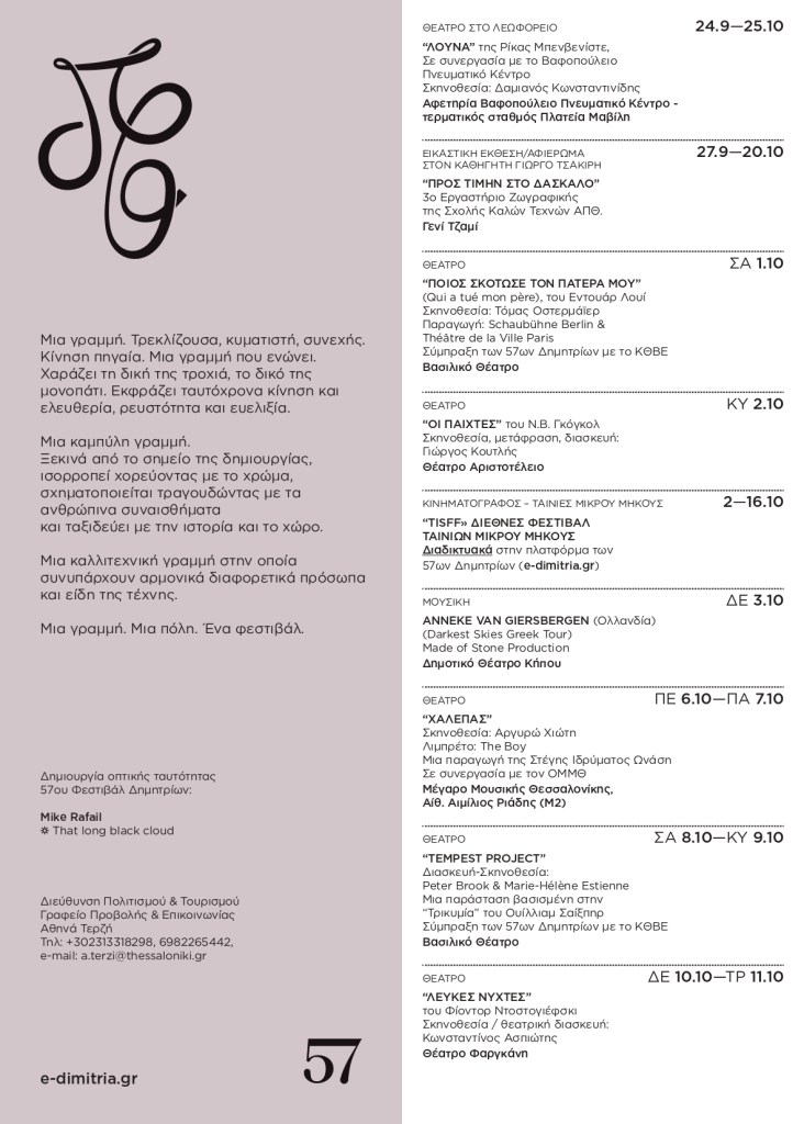 Το πλήρες πρόγραμμα των «Δημητρίων» είναι διαθέσιμο στην ιστοσελίδα του φεστιβάλ.
