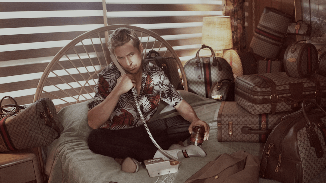 Φωτογραφημένος από τον έμπειρο φωτογράφο Glen Luchford, φορώντας πότε ένα στιλάτο 70s κοστούμι με το μονόγραμμα του οίκου, πότε ένα hawaian πουκάμισο με σακάκι και πότε μοκασίνια με κάλτσες, ο Γκόσλινγκ στοιβάζει τις υπέρκομψες βαλίτσες Gucci σε ένα αυτοκίνητο, τις απλώνει στην παραλία, ταξιδεύει ξανά και βρίσκεται διαρκώς σε κίνηση.
