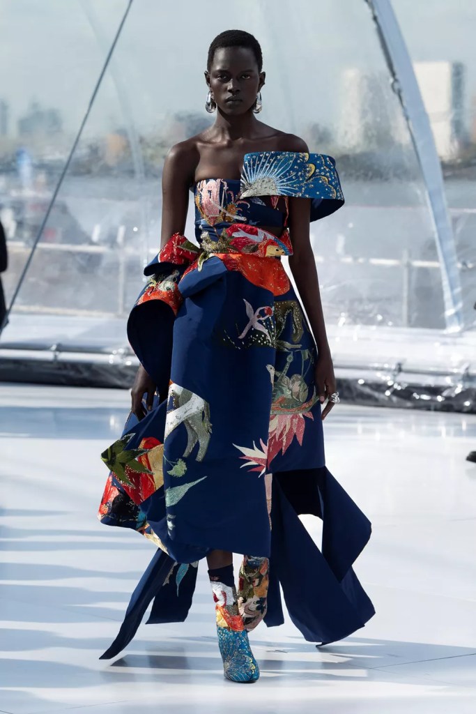 Το εξαιρετικό tailoring, τα τούλινα φορέματα και τα puff-sleeves, τα biker jackets και τα δυναμικά «δερμάτινα» κομμάτια είναι παρόντα και σ’ αυτή τη κολεξιόν, ωστόσο δοκιμάζονται μέσα από αποδομημένες σιλουέτες, που αποκτούν sharp cutouts (η Burton τα αποκαλεί «slashed»), ασύμμετρα μήκη και δεξιοτεχνικά κεντήματα τα οποία αναλαμβάνουν να δώσουν ζωή σε λεπτομέρειες από τα έργα του Μπος- και συγκεκριμένα από τον πίνακα «Ο κήπος των επίγειων απολαύσεων» (The Garden of Earthly Delights).