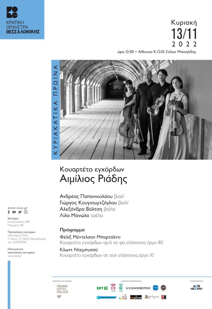 Η Κρατική Ορχήστρα Θεσσαλονίκης συνεχίζει τον αγαπημένο θεσμό των Κυριακάτικων Πρωινών με ένα από τα πλέον δραστήρια και διακεκριμένα σύνολα μουσικής δωματίου στην Ελλάδα, το κουαρτέτο εγχόρδων ‘Αιμίλιος Ριάδης’, που ερμηνεύει έργα Μέντελσον και Ντεμπυσσύ.
