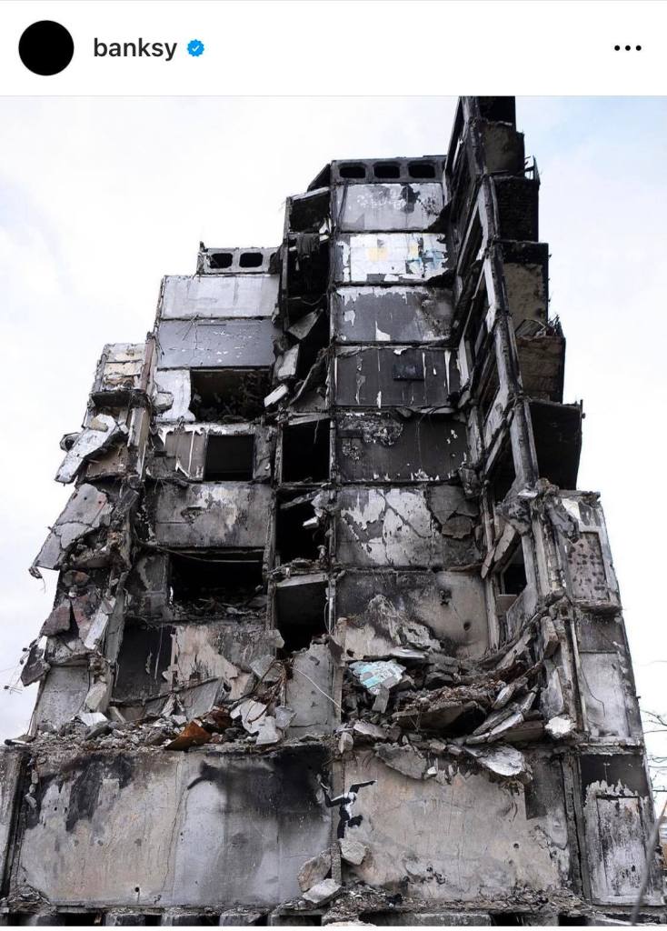 Ο Banksy επιβεβαίωσε μέσω του Instagram πως είναι δική του η τοιχογραφία που εμφανίστηκε πρόσφατα σε προάστιο της ουκρανικής πρωτεύουσας, σε ένα κατεστραμμένο σπίτι, με τη λεζάντα «Μποροντιάνκα, Ουκρανία». Να σημειωθεί πως η Μποροντιάνκα είναι προάστιο του Κιέβου που βομβαρδίστηκε ανηλεώς στη διάρκεια της ρωσικής εισβολής.