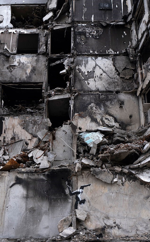 Το γκράφιτι απεικονίζει ένα κορίτσι που επιχειρεί κατακόρυφο, σε έναν τοίχο που στέκει ακόμη όρθιος στο βομβαρδισμένο σπίτι.