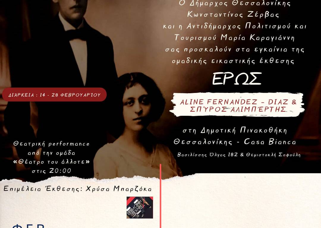 Εγκαινιάζεται στην Δημοτική Πινακοθήκη Θεσσαλονίκης , Casa Bianca, την Τρίτη 14 Φεβρουαρίου 2023, στις 19.30, η ομαδική εικαστική έκθεση, με τίτλο Έρως – Aline Fernandez-Diaz & Σπύρος Αλιμπέρτης.