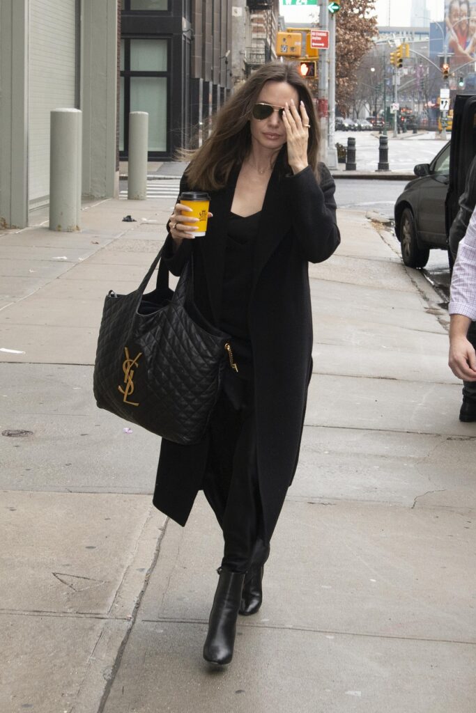 Το στοιχείο που ξεχώρισε αυτή τη φορά ήταν η τσάντα της: XL, πρακτική καπιτονέ Saint Laurent, το μοντέλο Icare, με το αναγνωρίσιμο λογότυπο του γαλλικού οίκου στο μπροστινό μέρος. Ένα ευέλικτο κομμάτι για να μεταφέρει κανείς μαζί του όλα όσα χρειάζεται, που ταιριάζει ιδανικά με ένα ζευγάρι ψηλές μπότες, όπως η Angelina ξεκαθάρισε.