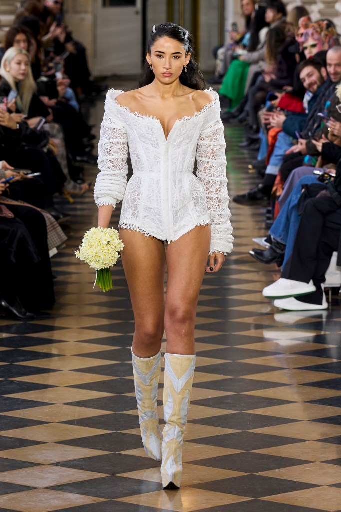 Η επίδειξη έκλεισε με ένα ανατρεπτικό νυφικό που φόρεσε η εγγονή της Γουέστγουντ, Cora Corre.