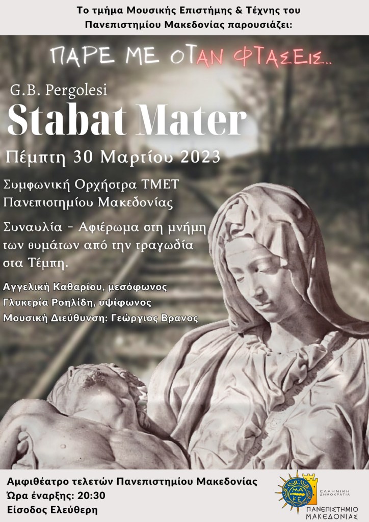 Η ορχήστρα εγχόρδων του Τμήματος Μουσικής Επιστήμης και Τέχνης, υπό την μουσική διεύθυνση του καθηγητή και Προέδρου του Τμήματος, Γεωργίου Βράνου, και σολίστες την αναπληρώτρια καθηγήτρια, μεσόφωνο Αγγελική Καθαρίου και την τελειόφοιτη υψίφωνο Γλυκερία Ροηλίδη από την Ειδίκευση «Οργανική Μουσική Εκτέλεση-Μονωδία», θα ερμηνεύσουν το πασίγνωστο και συγκινητικό «Stabat Mater» του Giovanni Battista Pergolesi. Πρόκειται για ένα έργο το οποίο έγραψε ο συνθέτης λίγες εβδομάδες πριν πεθάνει από φυματίωση, στα 26 του χρόνια.