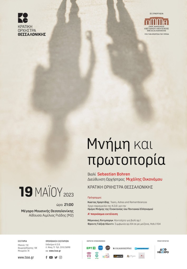 Η Κρατική Ορχήστρα Θεσσαλονίκης τιμά την Ημέρα Μνήμης της Γενοκτονίας του Ποντιακού Ελληνισμού με την παγκόσμια πρεμιέρα του έργου ‘Tears, Ashes and Remembrances’ του διεθνώς αναγνωρισμένου Έλληνα συνθέτη Κώστα Χρηστίδη, γραμμένο κατά παραγγελία της Κ.Ο.Θ. για την εθνική αυτή επέτειο. Την Κ.Ο.Θ. διευθύνει ο Μιχάλης Οικονόμου.