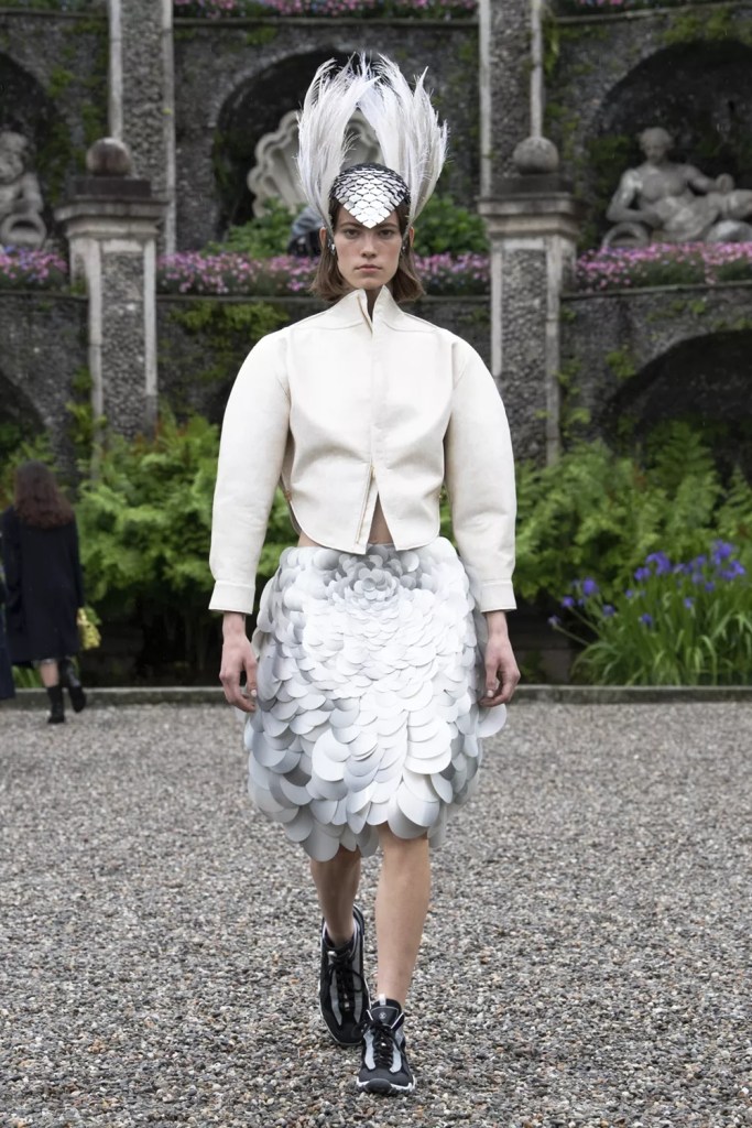 Σε επόμενα looks ανακαλύπτει επίσης κανείς μια μυθική διάσταση: τα μοντέλα με τα ολόσωμα neoprene κορμάκια, τα robe coats με μανίκια με εσωτερικό σκελετό και τα εντυπωσιακά headpieces θα μπορούσαν να είναι θαλάσσιες θεότητες, ενώ οι φούστες με oversized πούλιες που θυμίζουν λέπια, και συνδυάζονται με στρογγυλεμένα τζάκετ και headpieces με φτερά θα μπορούσαν να παραμπέμπουν σε μυθικά πλάσματα της θάλασσας όπως οι Νηρηίδες.