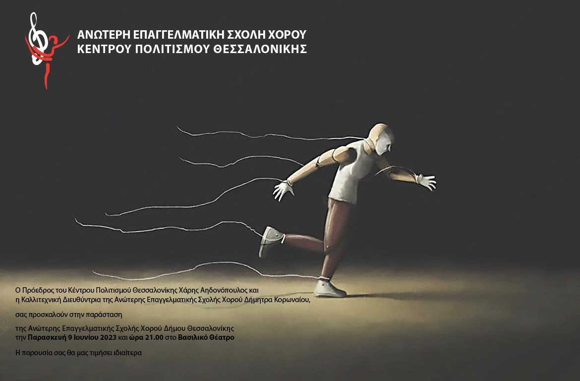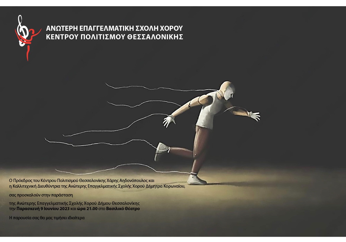 Την ετήσια παράστασή της θα δώσει η Ανώτερη Επαγγελματική Σχολή Χορού του Κέντρου Πολιτισμού Θεσσαλονίκης την Παρασκευή 9 Ιουνίου 2023 στις 21.00 στο Βασιλικό Θέατρο.