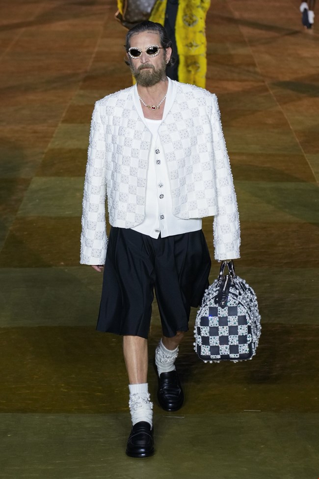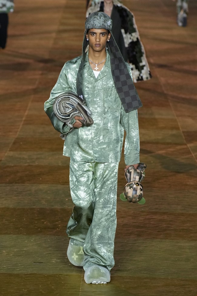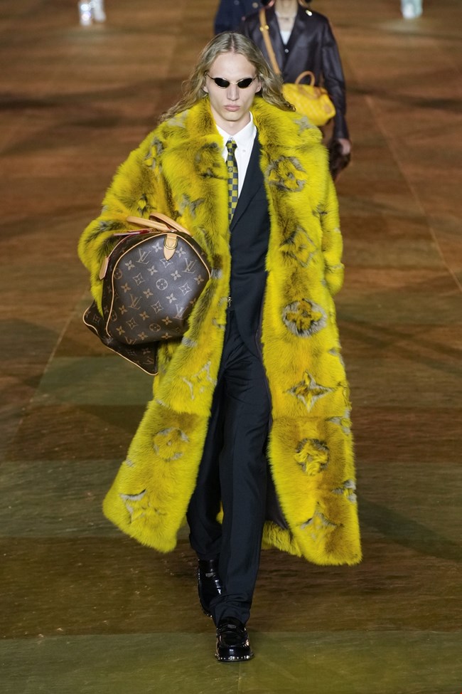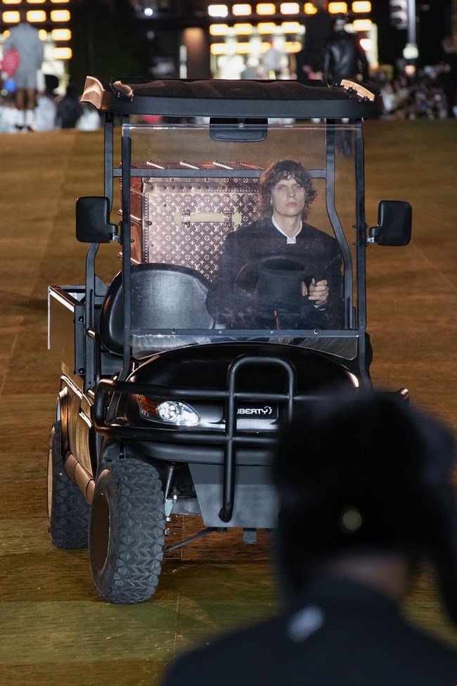 Η συνέχεια είχε από το ευρηματικό, και ομολογουμένως catchy, «LV-overs” το νέο motο που παίζει με iconic Monogram του Οίκου που βρέθηκε πάνω σε leather bomber jackets και puffer coats, μέχρι ένα αμαξάκι του γκολφ με τη λέξη «Liberty» στον πίσω προφυλακτήρα του «περπάτησε” κι αυτό στο catwalk, στοιβαγμένο με τα χαρακτηριστικά μπαούλα, κι αυτά σε σε Damouflage, που ήταν και το πρώτο καθοριστικό προϊόν της Louis Vuitton. Και φυσικά τσάντες – νέα και κλασσικά σχέδια σε πολλές εντυπωσιακές παραλλαγές και ζωηρά χρώματα πότε με το Monogram απαλλαγμένο από το εμβληματικό λουλούδι, μία νέα συνεισφορά του Pharrell, και πότε όχι.