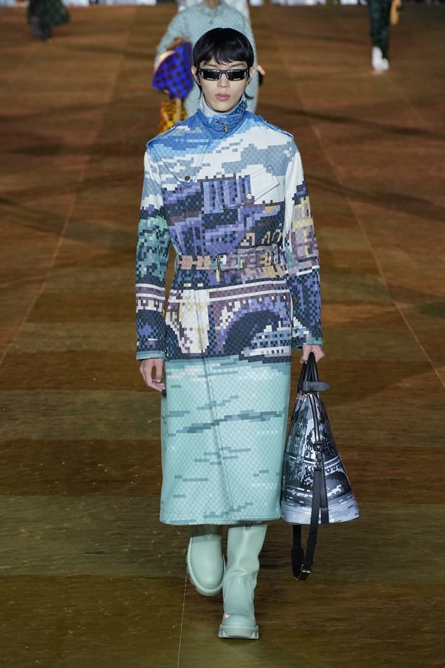 Πρωταγωνιστής της συλλογής το εμβληματικό σχέδιο σκακιέρας του Οίκου, LV Damier, όπως το φαντάστηκε απ’ την αρχή ο Pharrell. Όπως φαίνεται, ο νέος καλλιτεχνικός διευθυντής του menswear της Louis Vuitton κοίταξε το pattern από πολύ κοντά. Έπειτα, αποφάσισε να το μεγεθύνει όσο δεν πάει, μέχρι να πιξελιάσει, κι εκεί είδε το πάντρεμά του με την παραλλαγή. Το «Damoflage” είναι η νέα ισχυρή ταυτότητα της ανδρικής σειράς της Louis Vuitton, μία συγχόνευση του Damier με την παραλλαγή που θυμίζει γραφικά 8-bit Atari. Ένας μοναδικός τρόπος να μείνει άθικτο το DNA της Louis Vuitton και παράλληλα να αναδειχθεί το όραμα του νέου creative director. Το trench coat που μοιάζει φτιαγμένο από δίχτυ παραλλαγής σκίασης και φέρει το Damoflage print είναι ό,τι πιο refreshing έχουμε δει τον τελευταίο καιρό.