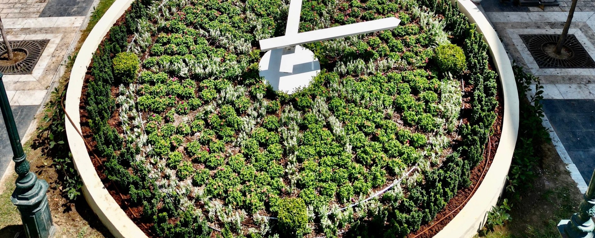 Το «Ρολόι Ανθοκομίας» στολίζουν 400 φυτά του είδους λαντάνα. Πρόκειται για φυτά που έχουν ανθοφορία όλο το καλοκαίρι και το φθινόπωρο -σε χρώμα φουξ με κόκκινο- και παράλληλα έχουν χαμηλή απαίτηση σε πότισμα. Τις φυτεύσεις συμπληρώνουν 500 λευκά αγγελόνια, που αγκαλιάζουν την περίμετρο του ρολογιού και τους δείκτες. Τα φυτά στο «Ρολόι Ανθοκομίας» θα ανανεώνονται ανά έξι μήνες, ώστε να υπάρχουν χρώμα και ζωντάνια όλες τις εποχές του χρόνου.