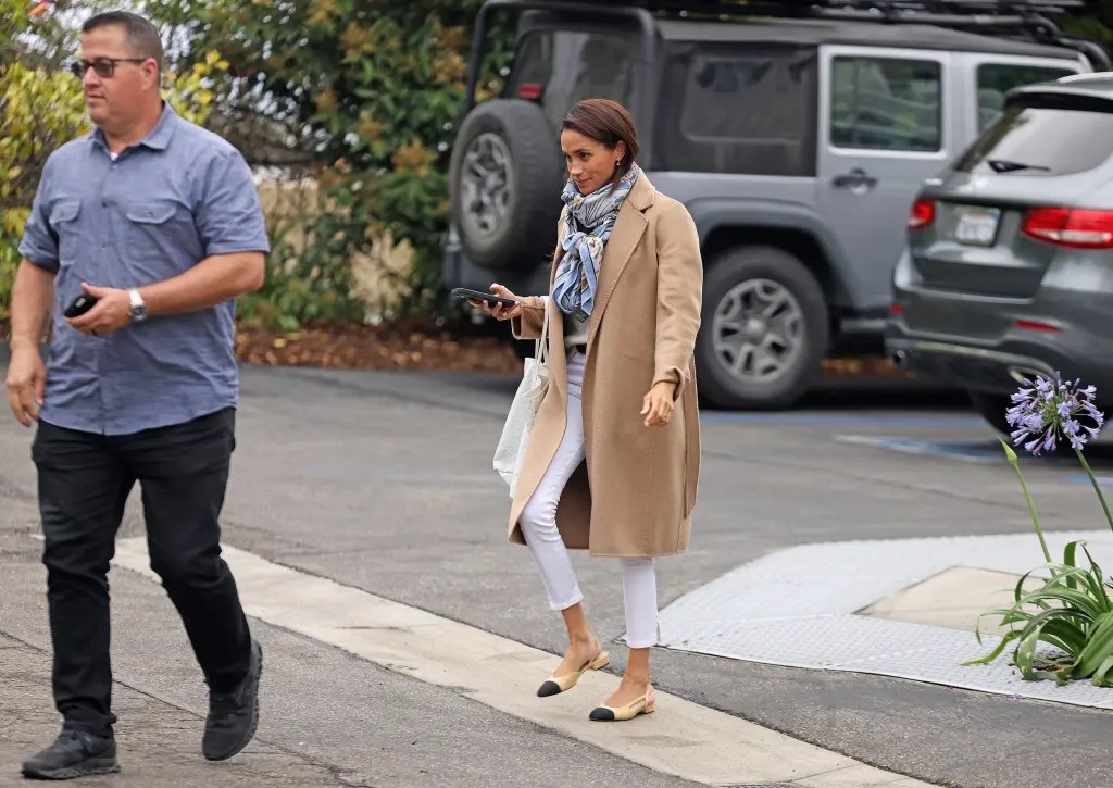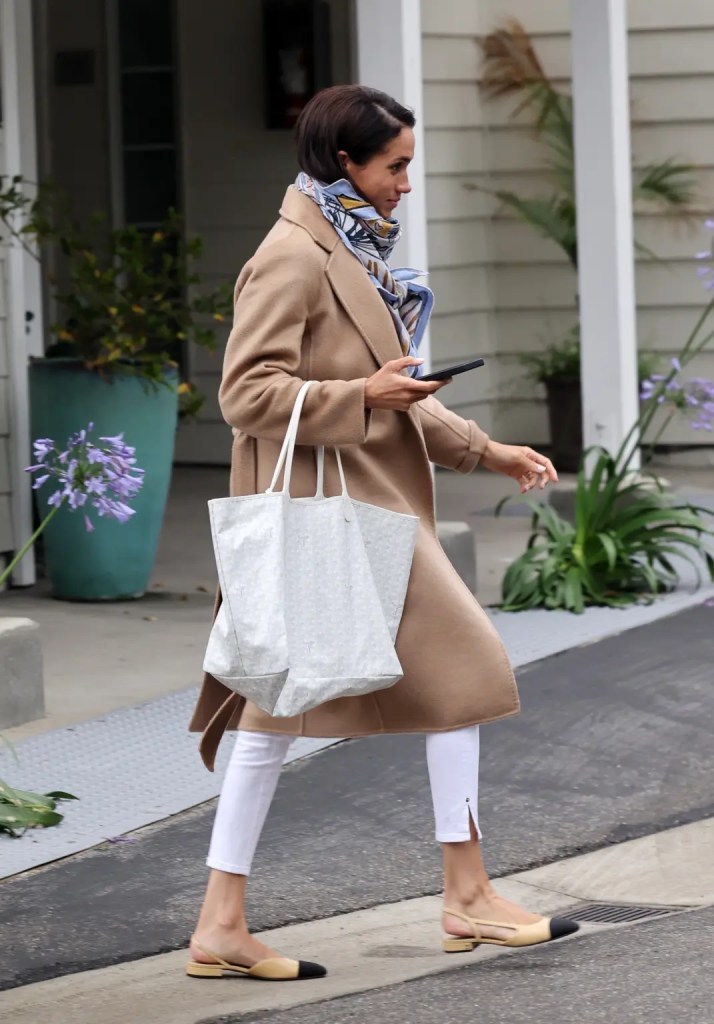 Η δούκισσα του Sussex απαθανατίστηκε στο Μοντεσίτο με ένα κομψό καμηλό παλτό Max Mara που κοστίζει 5.390 δολάρια και είναι πλέον sold out. Το συνδύασε με μπεζ πουλόβερ, λευκό κάπρι παντελόνι Frame και Chanel παπούτσια. Ολοκλήρωσε το look της με Givenchy ζώνη, tote τσάντα Goyard κι ένα κασμιρένιο φουλάρι Hermès.