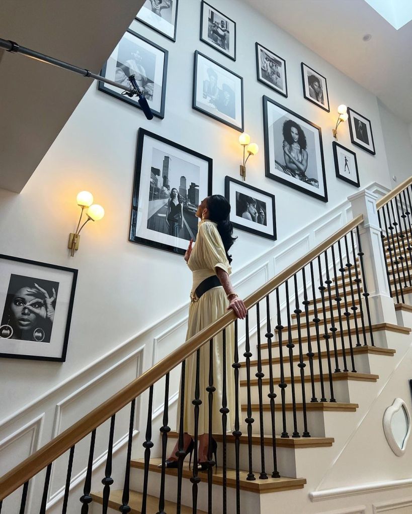 Για παράδειγμα, υπάρχουν χρυσά φυτά της δεκαετίας του 1970 που πλαισιώνουν το τζάκι , ένας πίνακας με το πορτρέτο της ζωγραφισμένο με μολύβι, και items όπως βάζα και άλλα που αναβαθμίζουν το στιλ του καθιστικού. Όσο για τους καναπέδες, συνδυάζουν άνεση και στιλ, μοιάζουν με έργα τέχνης αλλά είναι ταυτόχρονα άνετοι και «ζεστοί» χάρη στις καμπύλες.