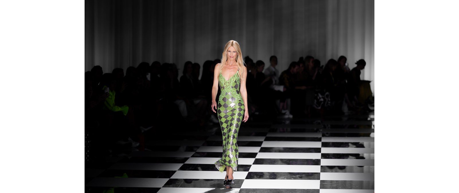Την έκπληξη έκανε η Claudia Schiffer στο Μιλάνο κλείνοντας το show του Versace στο πλαίσιο της Εβδομάδας Μόδας φορώντας ένα λαμπερό εφαρμοστό checkerboard μάξι φόρεμα της νέας συλλογής Άνοιξη – Καλοκαίρι 2024.