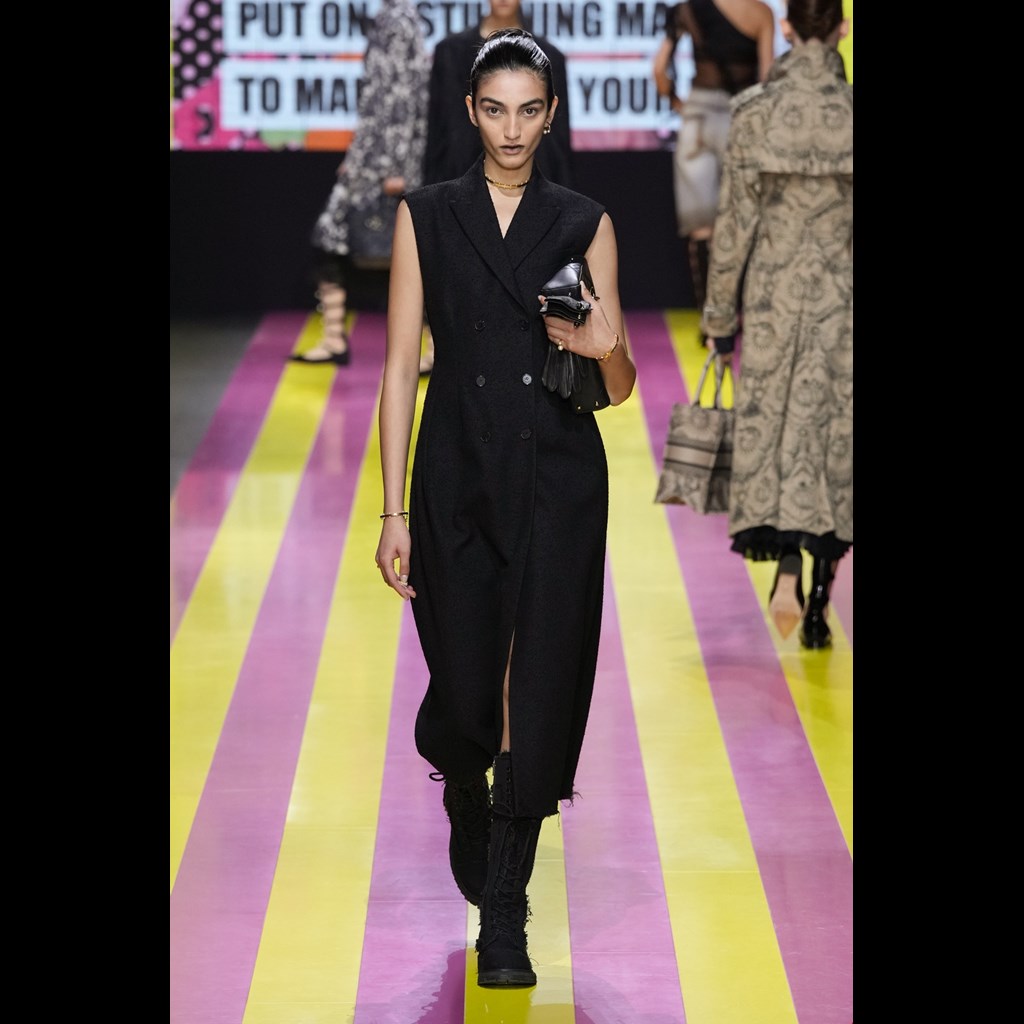 Με ένα βίντεο installation της Elena Bellantoni με τον τίτλο «NOT HER» να καταλαμβάνει όλους τους χώρους γύρω από το runway, αλλά και την ίδια την πασαρέλα που περπατούν τα μοντέλα, η συλλογή της Dior, περιορίστηκε σε βασικά χρώματα, και κυρίως στο μαύρο.
