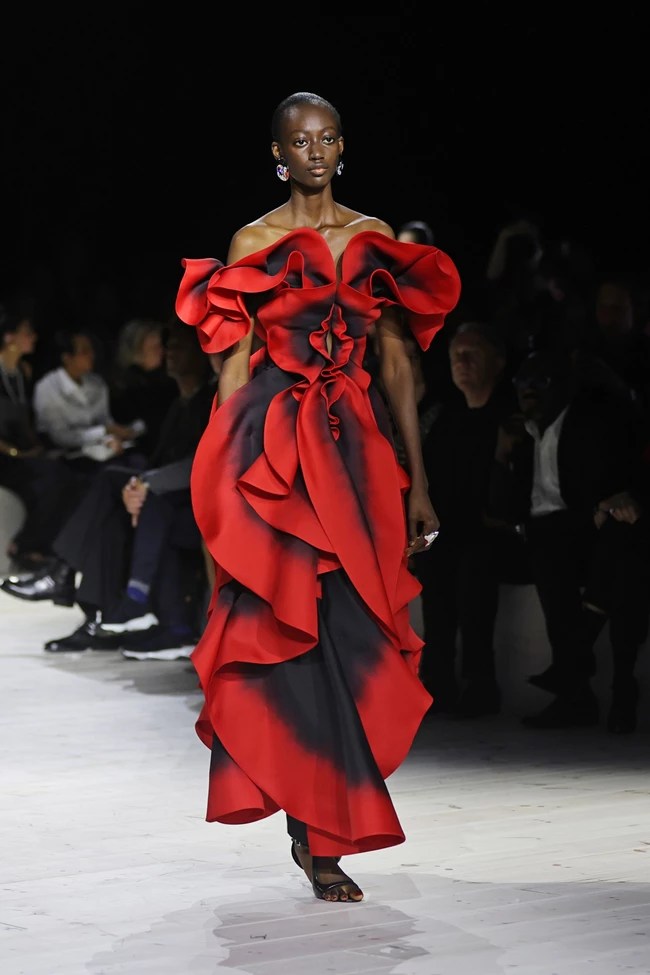 Πρώτη στο catwalk εμφανίστηκε η Kaia Gerber φορώντας ένα μάλλινο tailored φόρεμα με κοφτερές cutout λεπτομέρειες στο μπούστο και τους ώμους και κόκκινα lace – up κορδόνια στη ραχοκοκαλιά. Το sharp tailoring ήταν πάντα στην καρδιά των συλλογών της Burton και δικαιωματικά του ανήκε το πρώτο look σ’ αυτή τη τελευταία. Τα κοστούμια επίσης δεν απουσίαζαν, που η ανατομία του γυναικείου σώματος από το οποίο εμπνεύστηκε η δημιουργός τους τα έντυσε με κρόσσια που θυμίζουν αρτηρίες από τις οποίες τρέχει κατακόκκινο αίμα. Σε άλλες εκδοχές, το ανάγλυφο μπούστο ή το ενσωματωμένο στιβαρό κορσέ, οι quilted πιέτες που προσομοιάζουν με τα κόκαλα ενός σκελετού ή οι στρογγυλεμένοι ώμοι που παραπέμπουν καμπύλες, και εμφανίζονται σε σακάκια, παραπέμπουν χωρίς καμία παρερμηνεία στην πηγή έμπνευση και κάνουν το tailoring της επόμενης σεζόν συναρπαστικό σαν μία ιστορία που έρχεται να φωτίσει τη δύναμη και την ομορφιά του εσωτερικού και εξωτερικού κόσμου της γυναίκας.