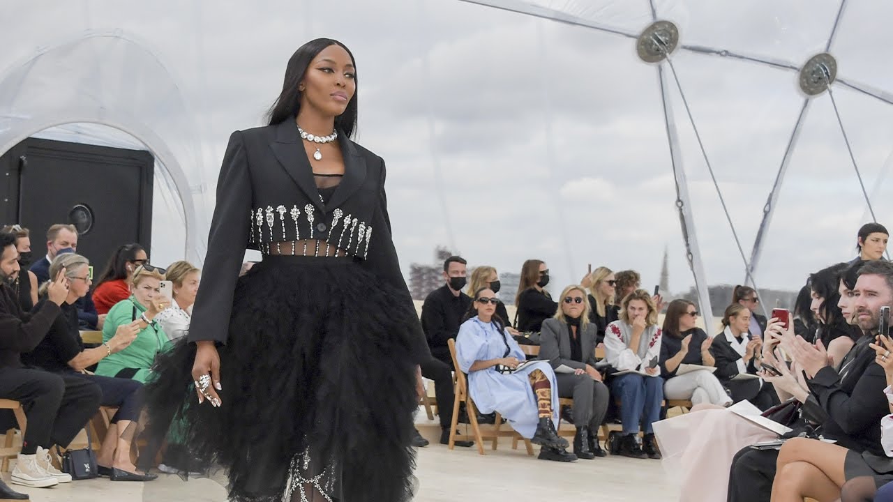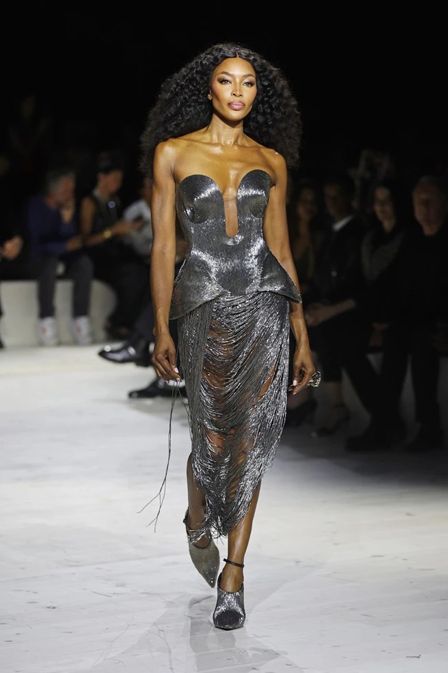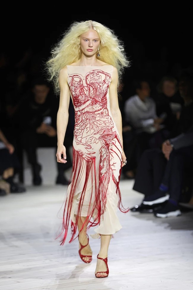 Συμπαγή κορσέ τοπ που ολοκληρώνονται από φούστες με κρόσσια ενωμένα μεταξύ τους (όπως το – οσονούπω iconic – metallic «open heart» κορσέ που καταλήγει σε τονισμένους γοφούς και συνδυάζεται με ασημί ντραμπέ φούστα από κρόσσια κεντημένα με χάντρες με το οποίο η Naomi Campbell έκλεισε το show), φορέματα και πανωφόρια με φτερά, ένα ντενιμ σετ με ραφές που παραπέμπουν σε στελέχη του σκελετού, ένα χρυσό δερμάτινο φόρεμα με κρόσσια και corset belt, μία ολόσωμη φόρμα κεντημένη με πέρλες και μεταλλικά ασημί νήματα, ένα χρυσό μεταλλικό bra top που θολώνει τα όρια ανάμεσα στο statement κόσμημα και το μπουστάκι φορεμένο μέσα από κοστούμι, ένα χρυσό φόρεμα που μοιάζει με τρισδιάστατη μπορντούρα, και εκείνο το μοναδικό highlight, το φόρεμα που πάνω του έχουν τυπωθεί οι φλέβες και οι αρτηρίες του ανθρώπινου σώματος οι οποίες καταλήγουν σε λεπτά κόκκινα κρόσσια που (προφανώς) συμβολίζουν το αίμα που ρέει απ’ αυτές, συμπληρώνουν την ανθολογία του έργου της Sarah Burton για τον Alexander McQueen. Ενός έργου που υπήρξε η σπουδή πάνω στην ευθραυστότητα, την ενσυναίσθηση και την ευαισθησία του γυναικείου ψυχισμού που συνυπάρχει με την ασίγαστη φλόγα, τη αδιάκοπα παλλόμενη ενέργεια και εν τέλει τη σαρωτική δύναμη της γυναικείας φύσης. Η πολυδιάστατη και πολύπλοκη φύση της γυναίκας, η ενδυνάμωση που οραματίστηκε και διεκδίκησε για τις γυναίκες εξ’ αρχής ο Lee Alexander McQueen, και η «στολή» που την ντύνει, είναι η παρακαταθήκη που αφήνει στον οίκο, και τη μόδα, η Burton.
