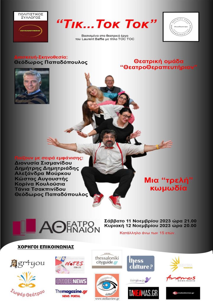 Η θεατρική ομάδα“Θεατροθεραπευτήριον” του πολιτιστικού συλλόγου “Κουκλοθυμικοί” παρουσιάζει την υπέροχη κωμωδία “Τικ…Τοκ Τοκ”βασισμένη στο έργο του Γάλλου συγγραφέα Laurent Βaffie, σε διασκευή και σκηνοθεσία Θεόδωρου Παπαδόπουλου.
