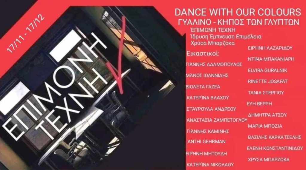 Στο γυάλινο του Κήπου Των Γλυπτών στη Νέα Παραλία Θεσσαλονίκης επιστρέφει με νέα εικαστική έκθεση η ομάδα Επίμονη Τέχνη με τον τίτλο ‘Dance with our colors» έως τις 17 Δεκεμβρίου.