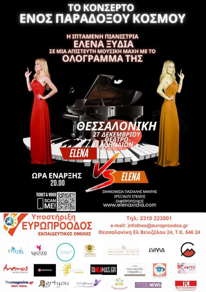 Μια μοναδική παράσταση που συνδυάζει τη μαγεία της μουσικής με πρωτοποριακή τεχνολογία!Ολοζώντανα ολογράμματα μουσικών εμφανίζονται στη σκηνή και μας ταξιδεύουν μουσικά σε μια άλλη διάσταση. Δύο πιανίστριες θα βρεθούν ταυτόχρονα στη σκηνή η Έλενα Ξυδιά με την Έλενα Ξυδιά σε μια επική μάχη με τον ίδιο της τον εαυτό! Μπορείς να ξεχωρίσεις την αληθινή από το ολόγραμμα; Ετοιμαστείτε να βιώσετε μια πρωτόγνωρη εμπειρία, όπου οι νότες γίνονται συναισθήματα και ο ρυθμός μετατρέπεται σε έκσταση!