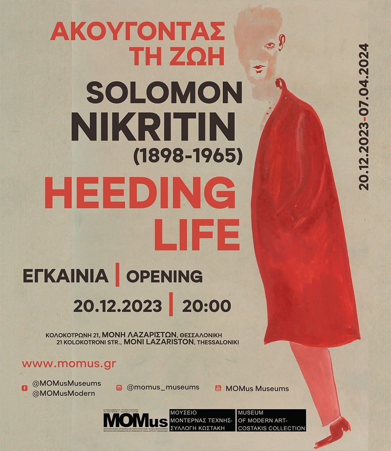 Μια μικροσκοπική φιγούρα στέκεται μόνη σε μια θολή νησίδα και πλαισιώνεται από ένα σύννεφο χρωμάτων με μικρές ιστορίες -όνειρα ή αναμνήσεις;- σε ένα γκρίζο φόντο. Μια γυναίκα ξεπροβάλλει από ένα δυστοπικό τοπίο με ένταση στην κίνηση και την κραυγή της. Άνθρωποι ρωμαλέοι, άνθρωποι σε πτώση, άνθρωποι σε πάθος, άνθρωποι που ακούν την ίδια τη ζωή πρωταγωνιστούν στο «καλλιτεχνικό και πλαστικό σενάριο» του Σολομόν Νικρίτιν στη νέα έκθεση που πρόκειται να παρουσιαστεί στο MOMus-Μουσείο Μοντέρνας Τέχνης-Συλλογή Κωστάκη, στη Μονή Λαζαριστών, στη Θεσσαλονίκη από τις 20 Δεκεμβρίου 2023 έως τις 07 Απριλίου 2024 (εγκαίνια: Τετάρτη 20 Δεκεμβρίου 2023, 20:00).