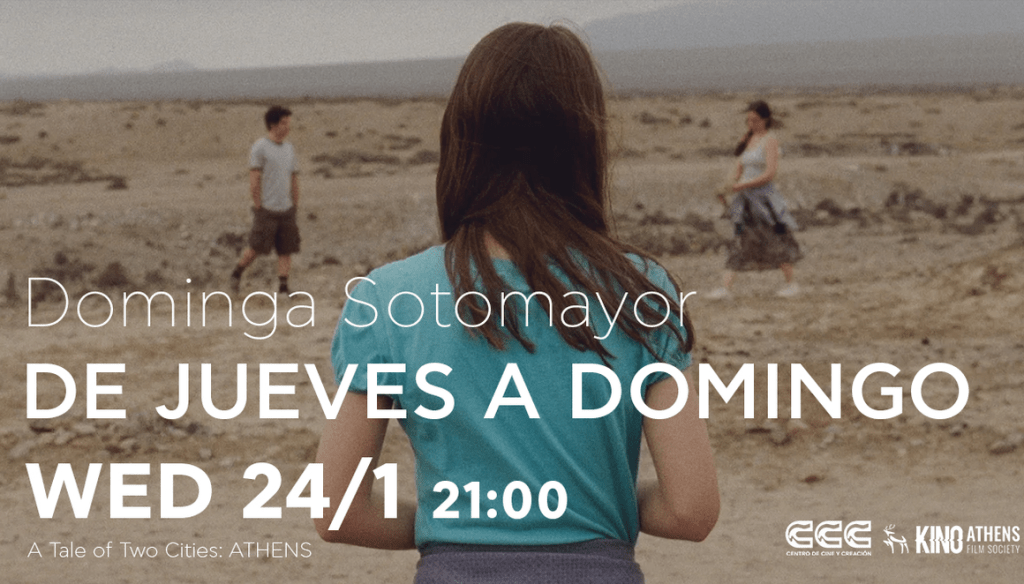 Η Αθήνα και το Σαντιάγκο είναι δύο πόλεις σε διάλογο, που συζητούν και ανταλλάσσουν κινηματογραφικά έργα με ταυτόχρονες προβολές. Το πρόγραμμα είναι μια συνεργατική δράση του Φεστιβάλ Ανεξάρτητου Κινηματογράφου της Αθήνας ΚΙΝΟ ΑΤΗΕΝS και του Centro De Cine Y Creación (CCC) από το Σαντιάγκο και ξεκινά με δύο παράλληλες προβολές σε Χιλή και Ελλάδα στις 24 Ιανουαρίου 2024. Η εναρκτήρια δράση στο Σαντιάγκο περιλαμβάνει την προβολή της ελληνικής ταινίας Attenberg, σε σκηνοθεσία της Αθηνάς Τσαγγάρη, ενώ στην Αθήνα θα πραγματοποιηθεί την Τετάρτη 24 Ιανουαρίου 2024, 21:00, στο Booze Cooperativa, η προβολή της ταινίας De jueves a domingo (Thursday till Sunday), σε σκηνοθεσία Dominga Sotomayor Castillo, μια παραγωγή από Χιλή και Ολλανδία. Το αναλυτικό πρόγραμμα προβολών θα ανακοινωθεί σύντομα.