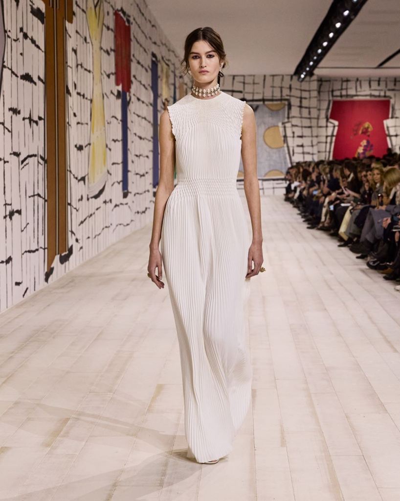 Μία κάπα και ένα τοπ από φτερά, ένα βελούδινο φόρεμα με αέρινη κίνηση, φαρδιές φούστες και sheer τοπ κεντημένα με κρυστάλλους, μαύρα και λευκά (αρχαιοελληνικού τύπου) πλισέ φορέματα και ένα έντονο κίτρινο στράπλες φόρεμα με κεντημένα φλοράλ μοτίβα συμπληρώνουν τα looks της συλλογής Dior Haute Couture SS’24.