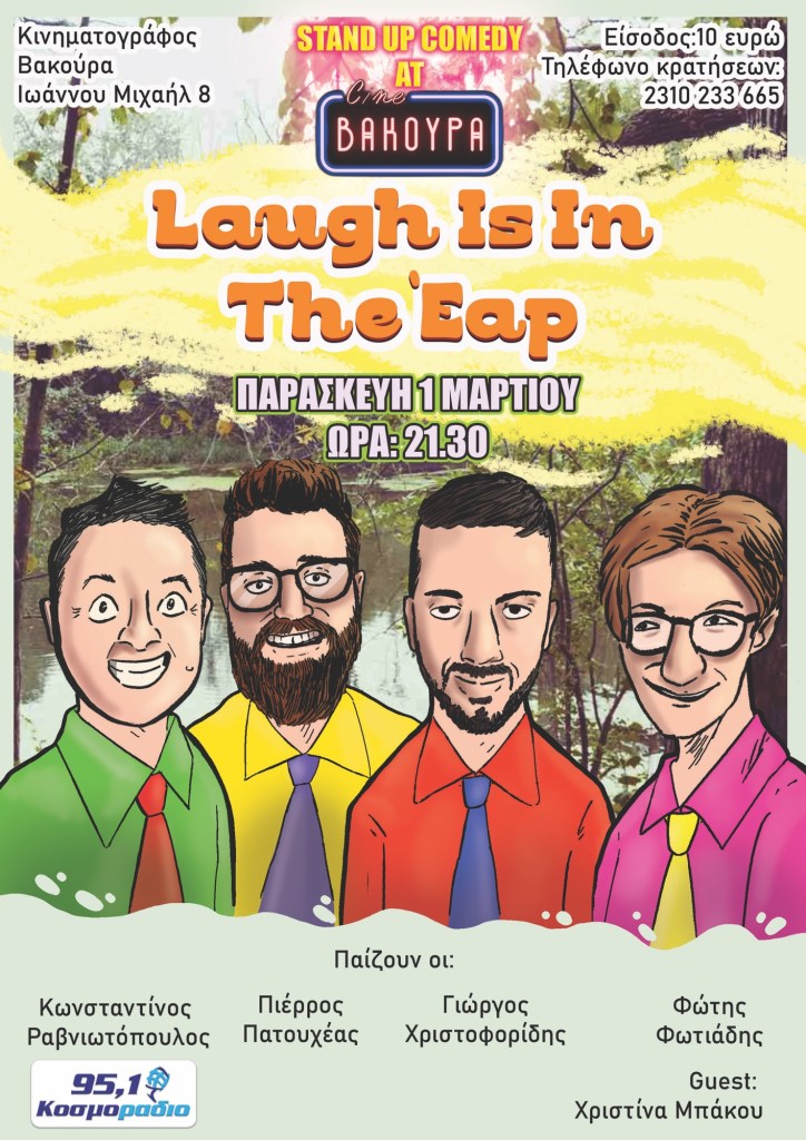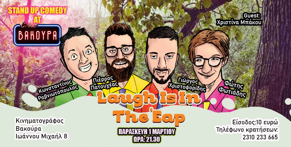 Άνοιξη… τα λουλούδια ανθίζουν, τα πουλάκια τραγουδούν, και το Cine Βακούραφιλοξενεί μία εαρινή κωμική παράσταση άνευ προηγουμένου. Οι κωμικοί Πιέρρος Πατουχέας, Κωνσταντίνος Ραβνιωτόπουλος, Φώτης Φωτιάδης και Γιώργος Χριστοφορίδης σπέρνουν ανοιξήτιλα αστεία για να θερίσουν γέλια και ξεκαρδιστικές αντιδράσεις!